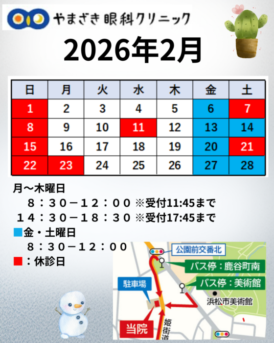 2026年2月の診療予定についてお知らせいたします。2月は、土曜日が隔週で休診となりますので、ご来院の際はご注意ください。