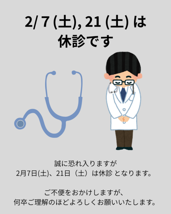 誠に恐れ入りますが、2月7日(土)、21日(土)は休診 とさせていただきます。