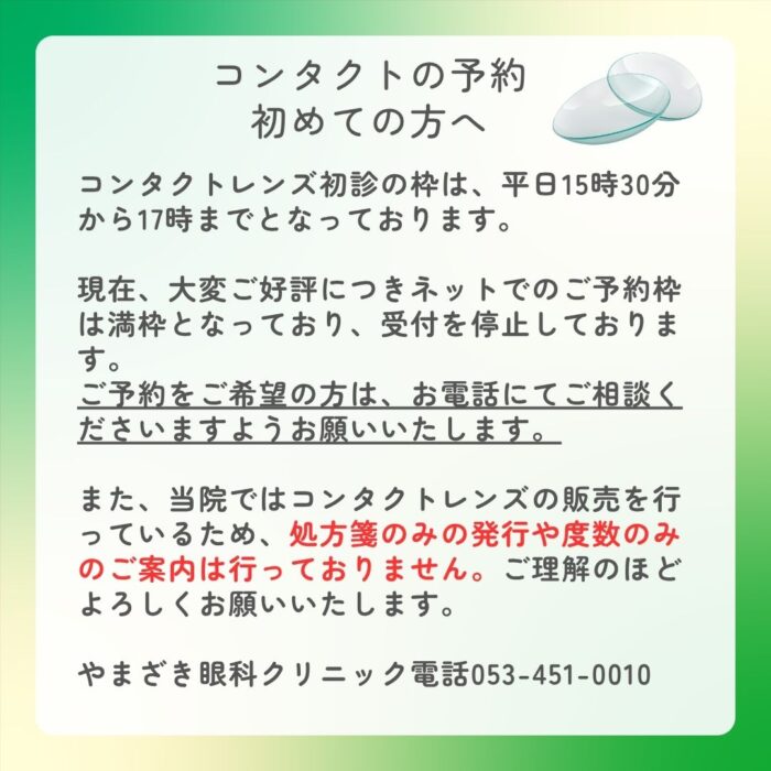 なお、コンタクトレンズが初めての方や、当院で初めてコンタクトレンズをお試しになる方のご予約は、取りにくい状況となっております。あらかじめご了承ください。